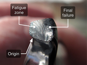 Materials fatigue is caused by cyclic or repetition of stress like a bicycle pedal going around and around and around until it breaks after 40 million rotations. The space in the fracture of mental and metal