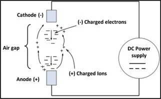 The electrical discharge appears when a voltage is applied to an electrode gap in a vacuum.