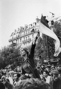Demonstration in the Quartier Latin in Paris, 1968. Caroline de Bendern holds a Vietnamese flag on the Boulevard Saint-Michel. Photograph: Jean-Pierre Rey/Gamma-Rapho via Getty Images